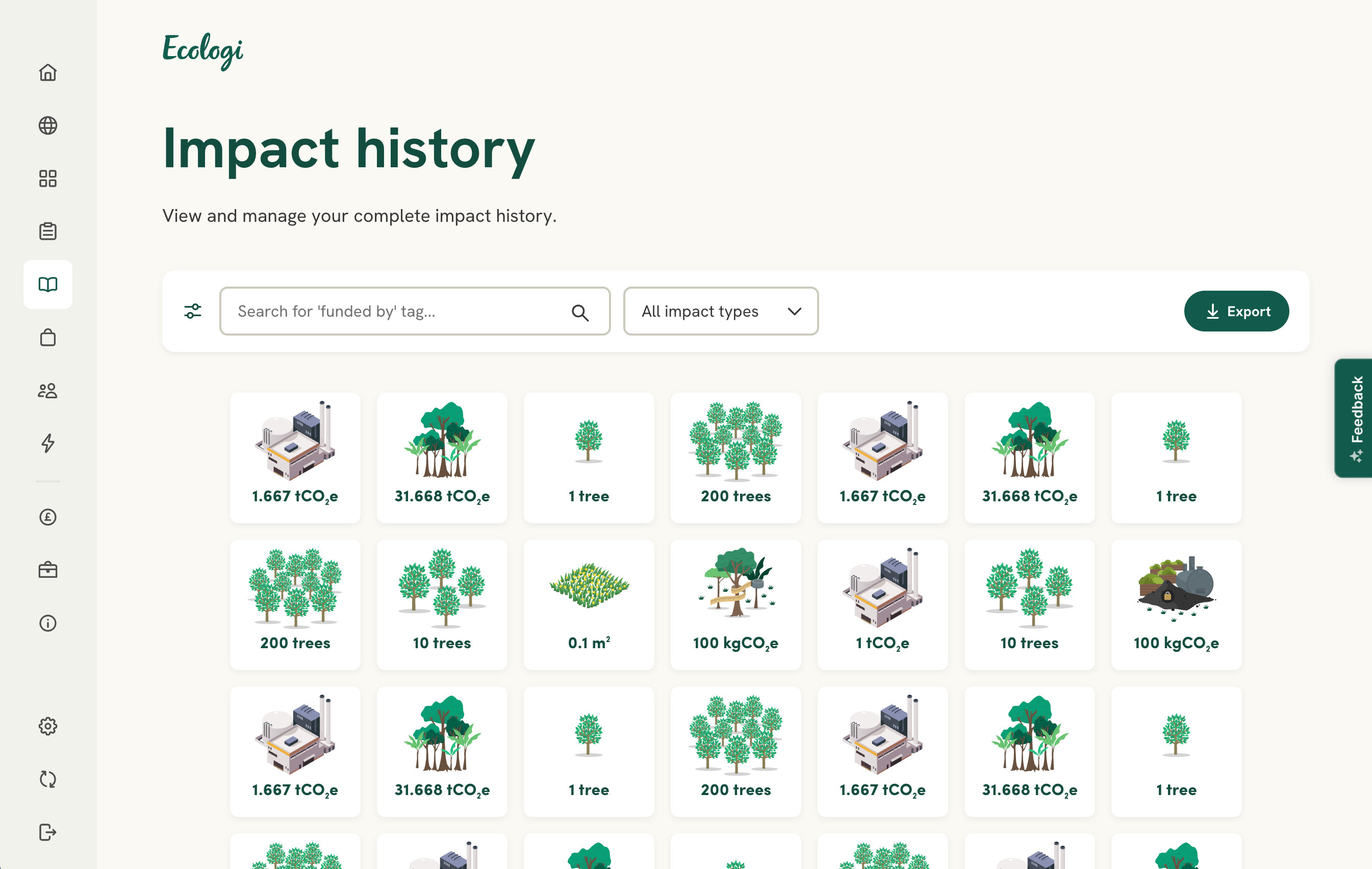 The impact history page in the new app has gotten a complete overhaul. You can now visualise your complete impact history at Ecologi with our beautiful impact tiles directly within the app.