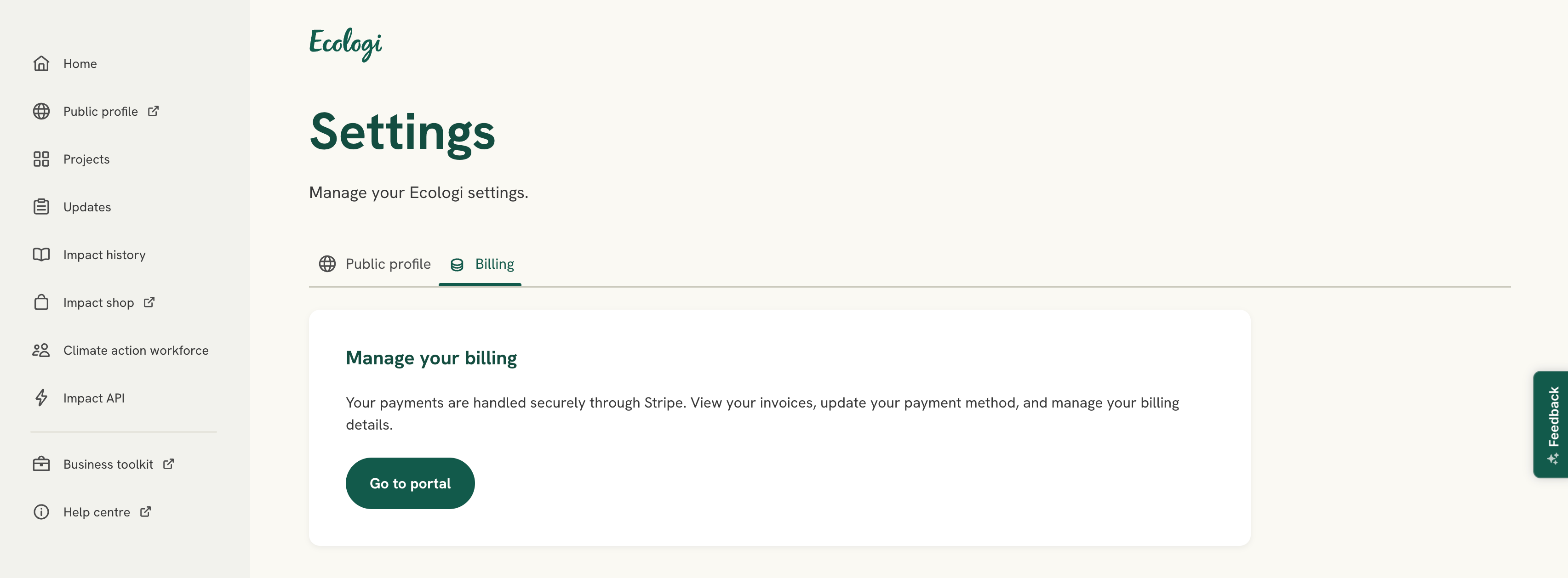 From here, you can browse your full invoice history, update your billing details, and manage your payment methods, all through Stripe's secure and polished billing portal. You'll also find your Climate action workforce subscription front and centre, so you always know where your impact spending stands.