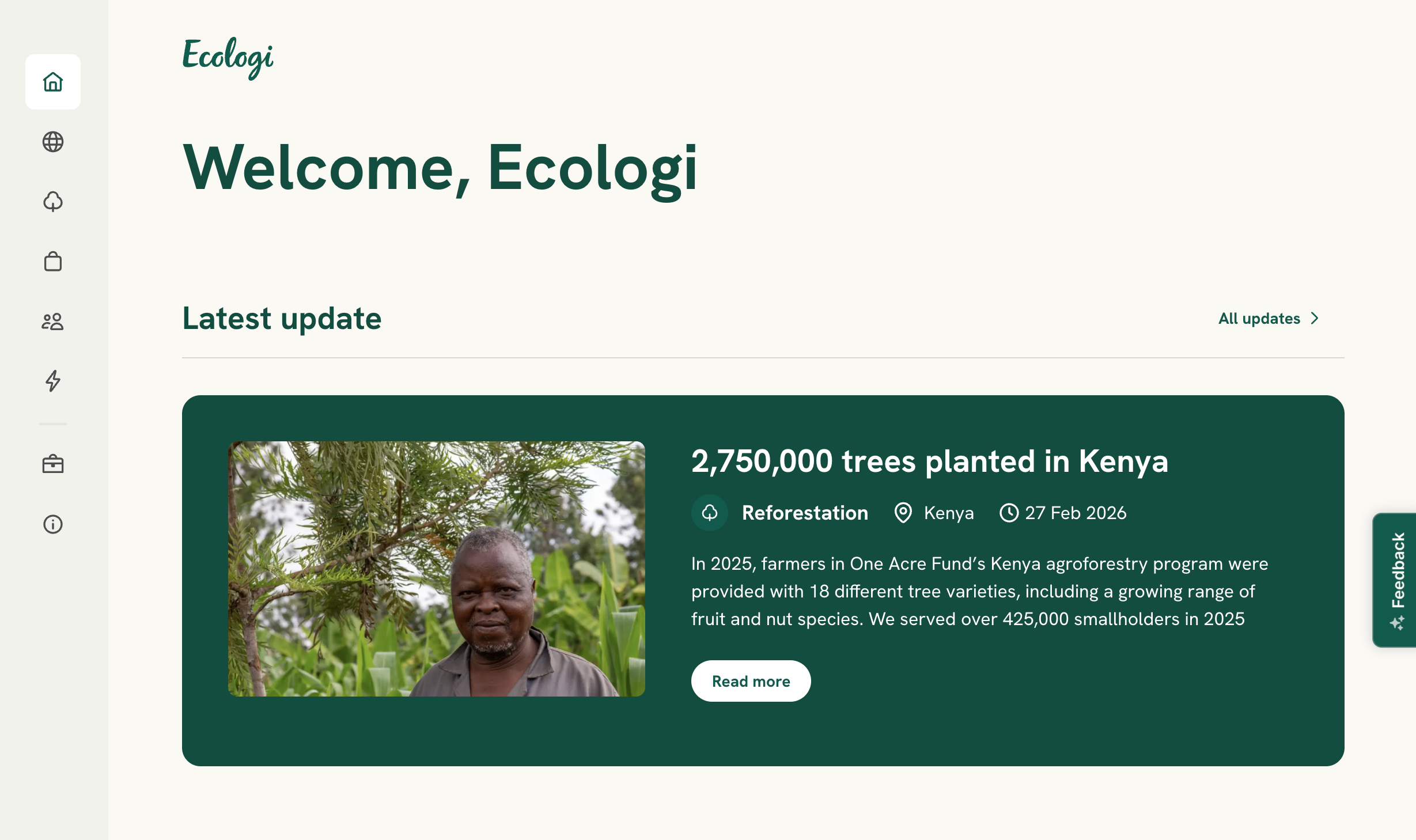 We’ve completely reimagined the Ecologi homepage. Our goal? To celebrate your incredible impact and bring the stories of the projects you support directly to you, making it easier than ever to explore everything Ecologi has to offer. Your homepage now includes: