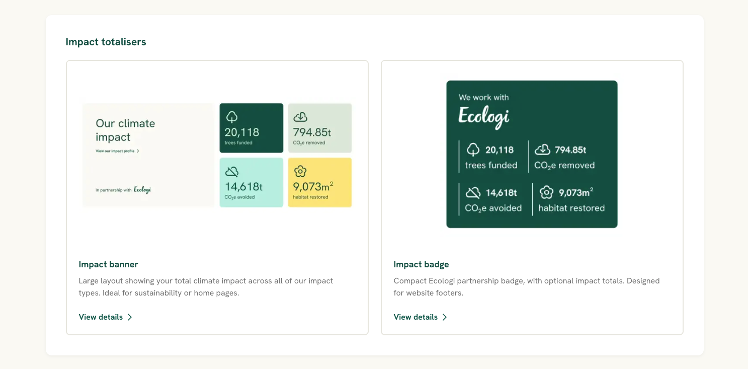 Impact totals banner: A dynamic snapshot of your cumulative climate impact. Designed to sit on your home or sustainability page.